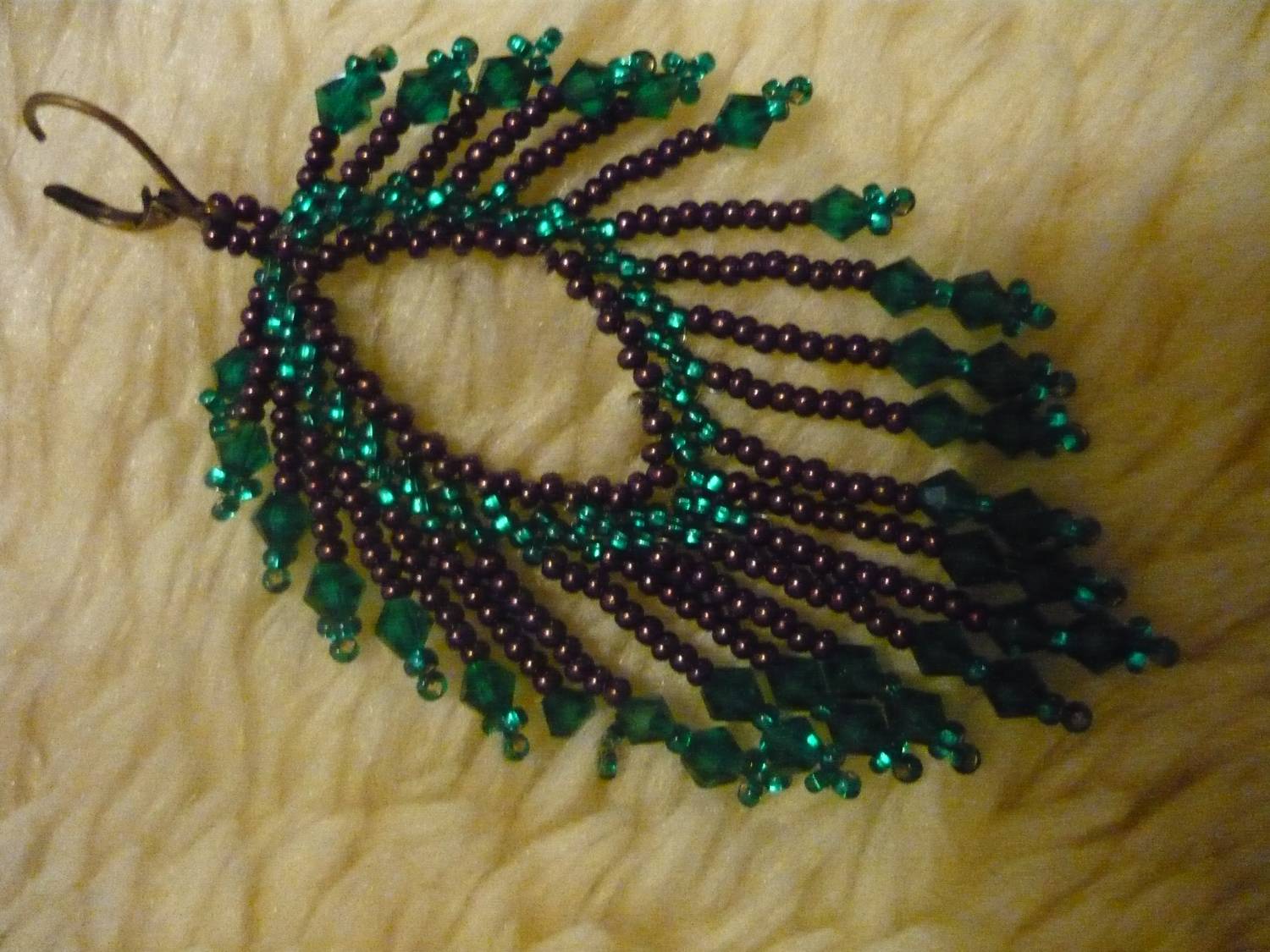| вот обсуждали серьги. Я попробовала сплести ! Фото без стразы, но потом я её вшила в середину.... не купила батарейки для фотика чтобы сфоткать готовую...